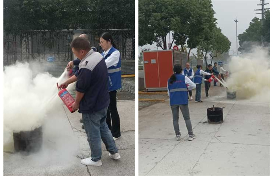 在灭火行动组指导下,员工分组使用干粉灭火器扑灭模拟火源,牢记“提、拔、握、压”四步口诀(对准火源根部喷射)。