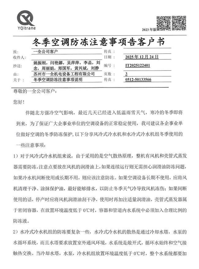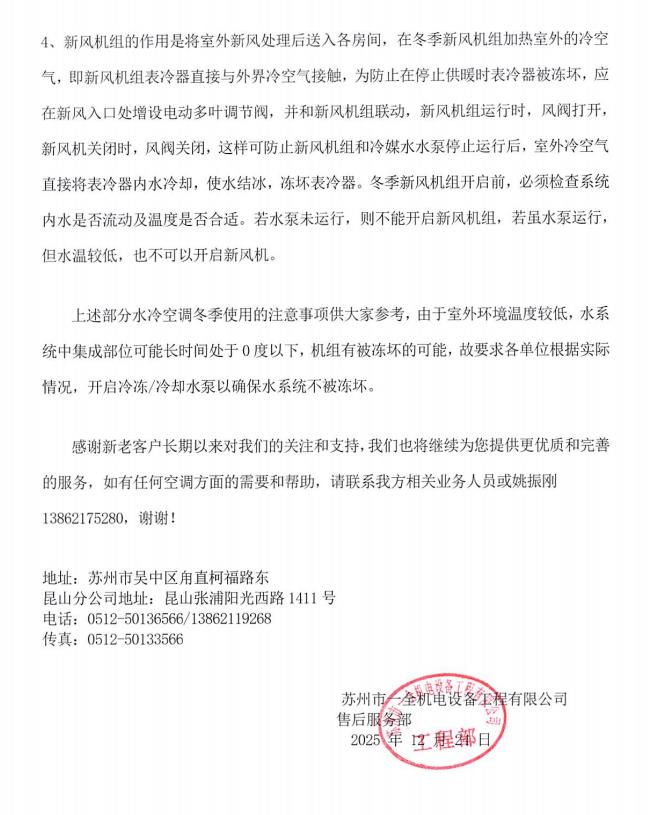冬季空调防冻注意事项告客户书