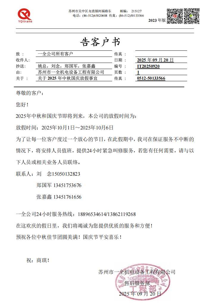 告客户2025年中秋国庆放假通知